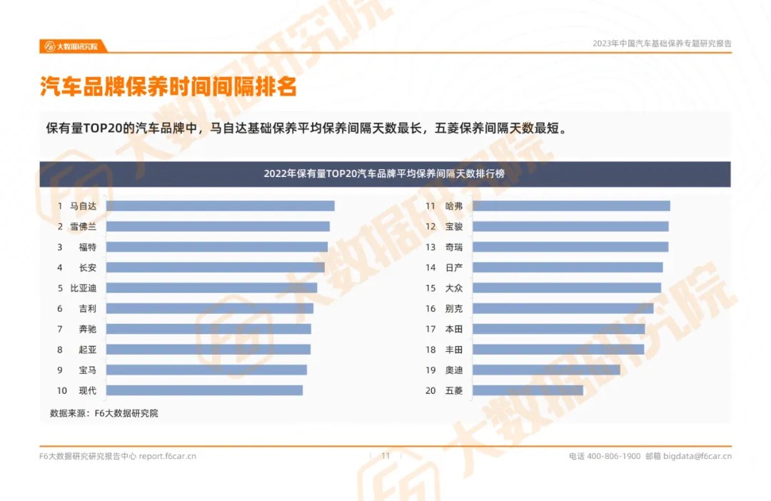 ▍Among the top 20 car brands in terms of ownership, Mazda has the longest average maintenance interval for basic maintenance, while Wuling has the shortest maintenance interval.