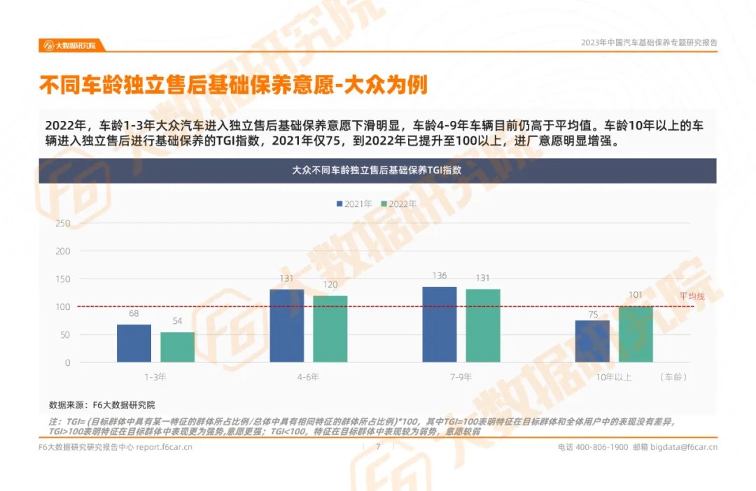 ▍In 2022, Volkswagen's willingness to enter independent after-sales basic maintenance for vehicles aged 1-3 years has significantly declined, and vehicles aged 4-9 years are still above average. The willingness of vehicles over 10 years old to undergo basic maintenance through independent after-sales service has significantly increased.