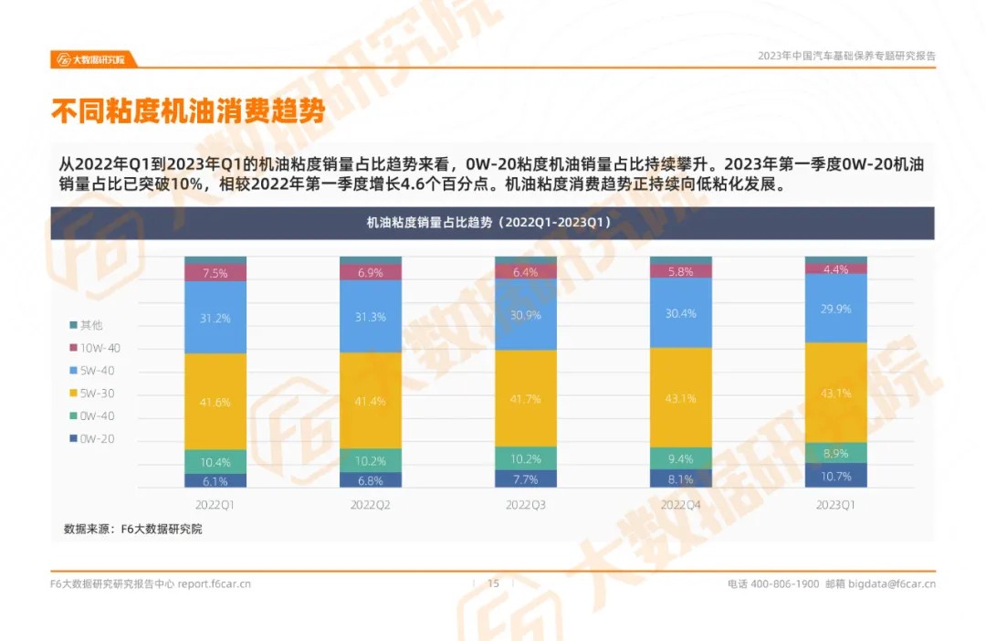 ▍From Q1 2022 to Q1 2023, the sales proportion of 0W-20 viscosity engine oil continues to rise. The proportion of 0W-20 engine oil sales in the first quarter of 2023 has exceeded 10%, an increase of 4.6 percentage points compared to the first quarter of 2022. The consumption of engine oil is continuing to develop towards a trend of low viscosity.