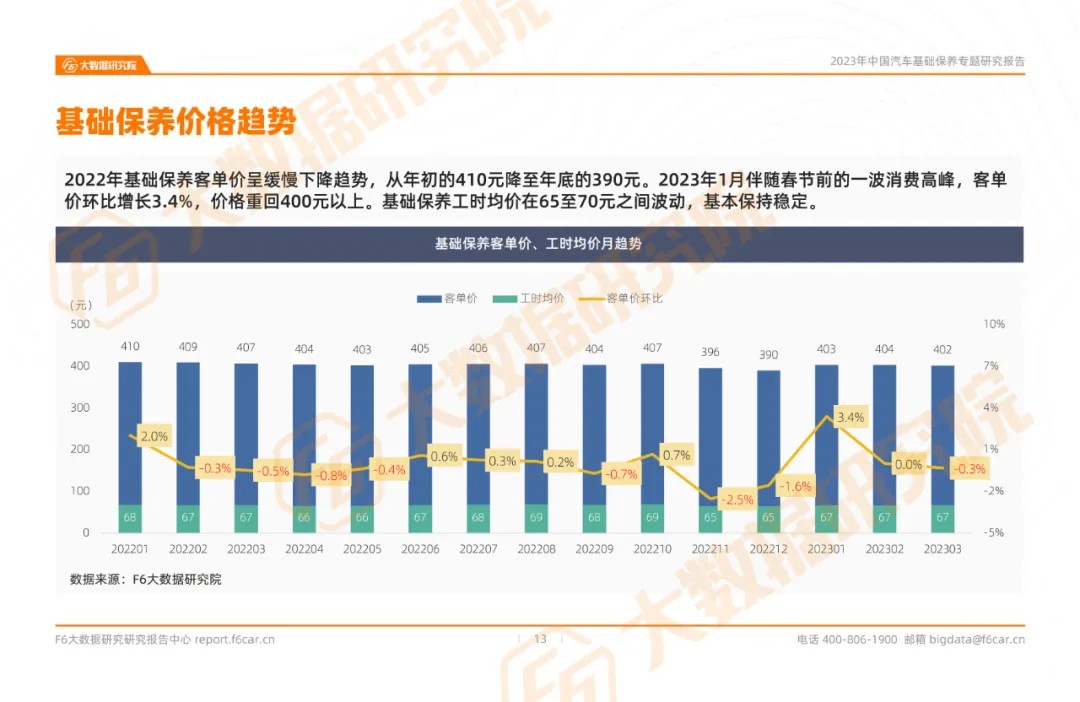 ▍The unit price of basic maintenance in 2022 is showing a slow downward trend, dropping from 410 yuan at the beginning of the year to 390 yuan at the end of the year. In January 2023, with a wave of consumption peak before the Spring Festival, the average unit price increased by 3.4% month on month, and the price returned to over 400 yuan. The average cost of basic maintenance hours fluctuates between 65 and 70 yuan, but remains relatively stable.