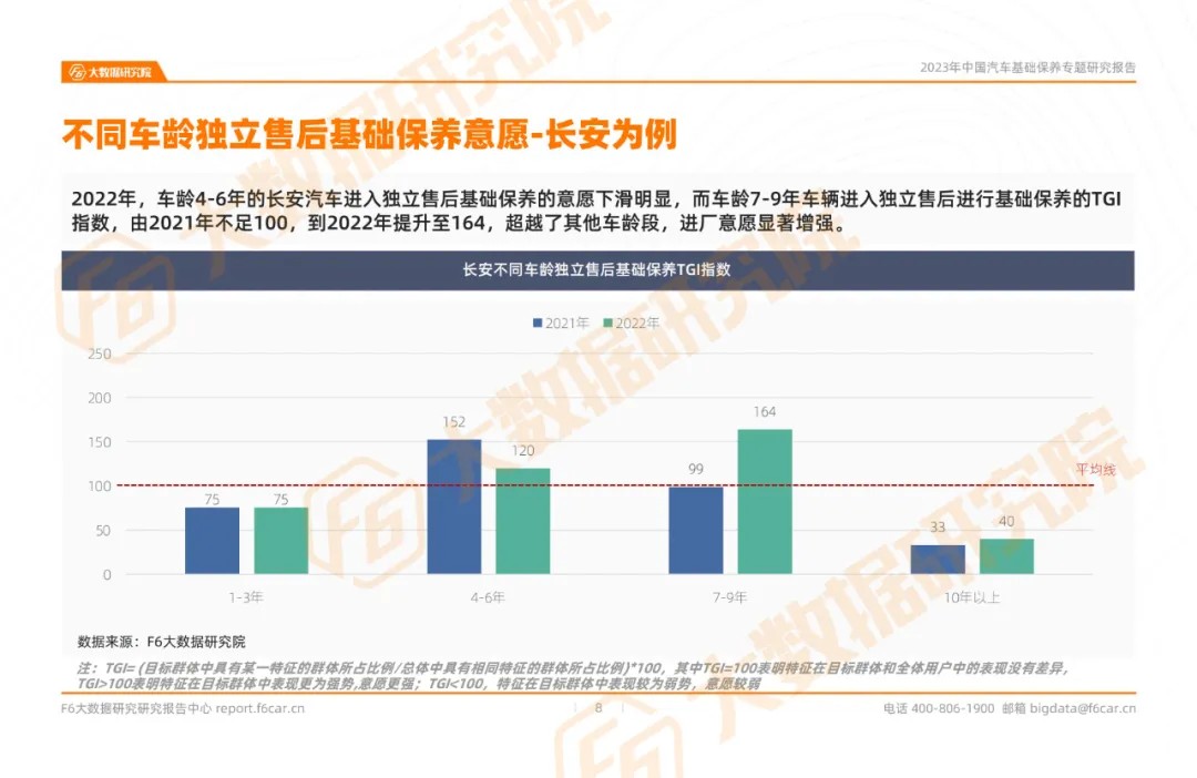▍In 2022, the willingness of Changan Automobile with 4-6 years of age to enter independent after-sales basic maintenance has significantly declined, while the TGI index of vehicles with 7-9 years of age entering independent after-sales basic maintenance has surpassed other age groups, indicating a significant increase in the willingness to enter the factory.