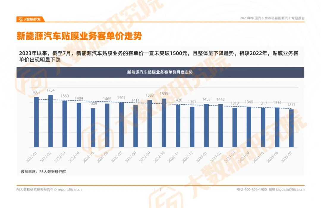 ➤ Since 2023, as of July, the average unit price of new energy vehicle film business has not exceeded 1500 yuan and is generally on a downward trend. Compared to 2022, the unit price of the film sticking business has significantly decreased.