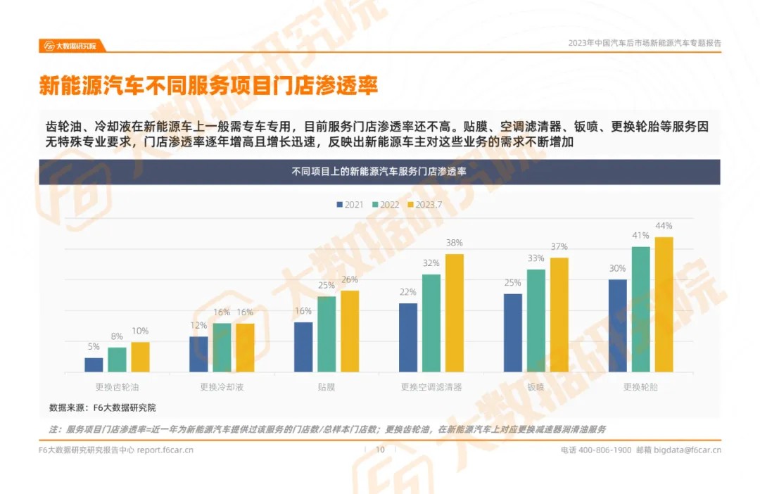 ➤ The penetration rate of gear oil and coolant in different service stores for new energy vehicles generally requires dedicated vehicles, and currently the penetration rate of service stores is not high. Due to the lack of special professional requirements for services such as film application, air conditioning filters, sheet metal spraying, and tire replacement, the penetration rate of stores has been increasing year by year and growing rapidly, reflecting the increasing demand for these services from new energy vehicle owners.