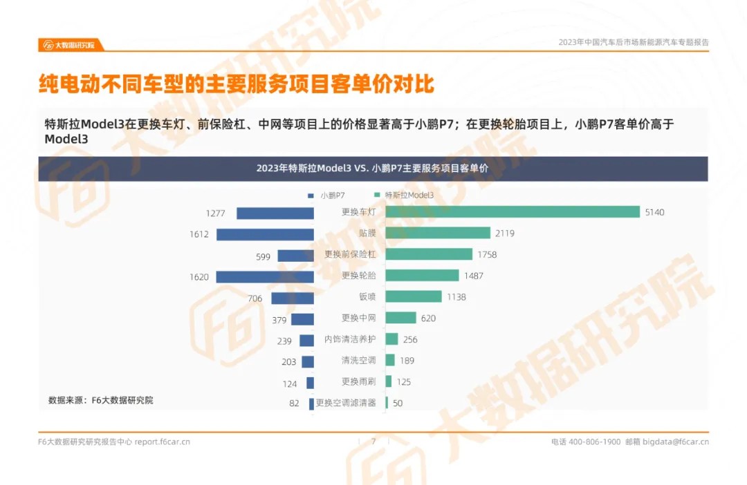 ➤ The main service items of different electric models are compared in terms of unit price. Tesla Model 3 has significantly higher prices for replacing headlights, front bumper, grille, and other items than Xiaopeng P7. In terms of tire replacement, Xiaopeng P7 has a higher unit price than Model 3.