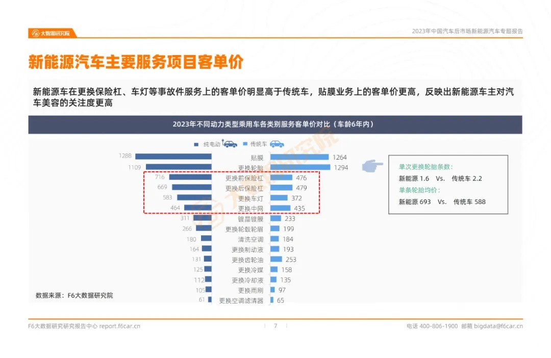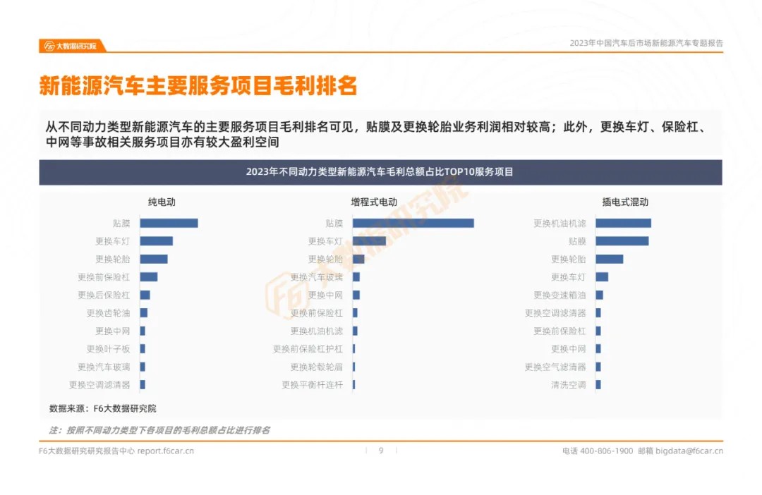 From the gross profit ranking of the main service items of different power types of new energy vehicles, it can be seen that the profit of film sticking and tire replacement business is relatively high;