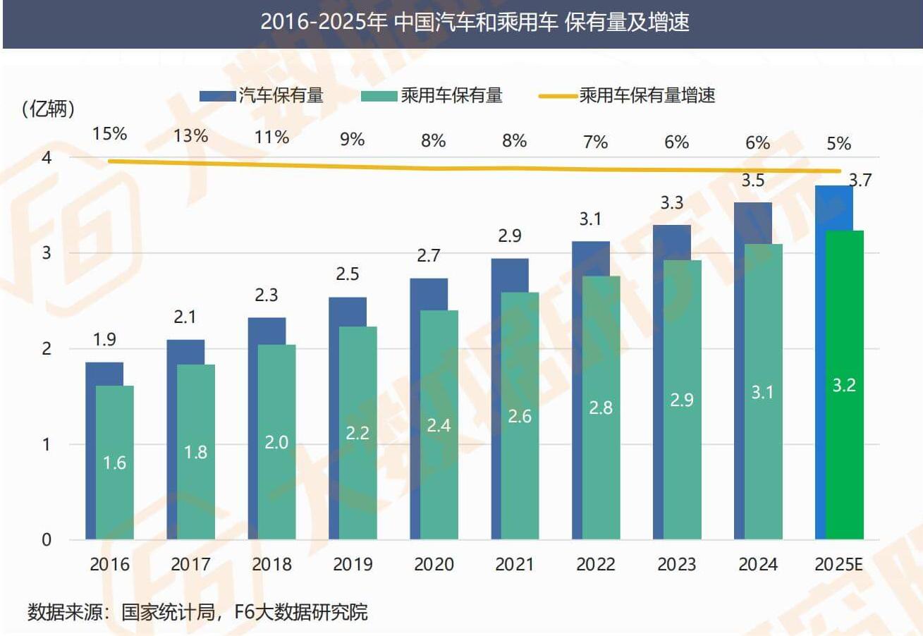 As of the end of 2024, the number of automobiles in China has reached 350 million, including 310 million passenger cars, a year-on-year increase of 6%. Since 2016, the growth rate of passenger car ownership has gradually slowed down, but the growth trend remains unchanged. It is expected that the car ownership will exceed 370 million by 2025, and the passenger car ownership will reach 320 million.