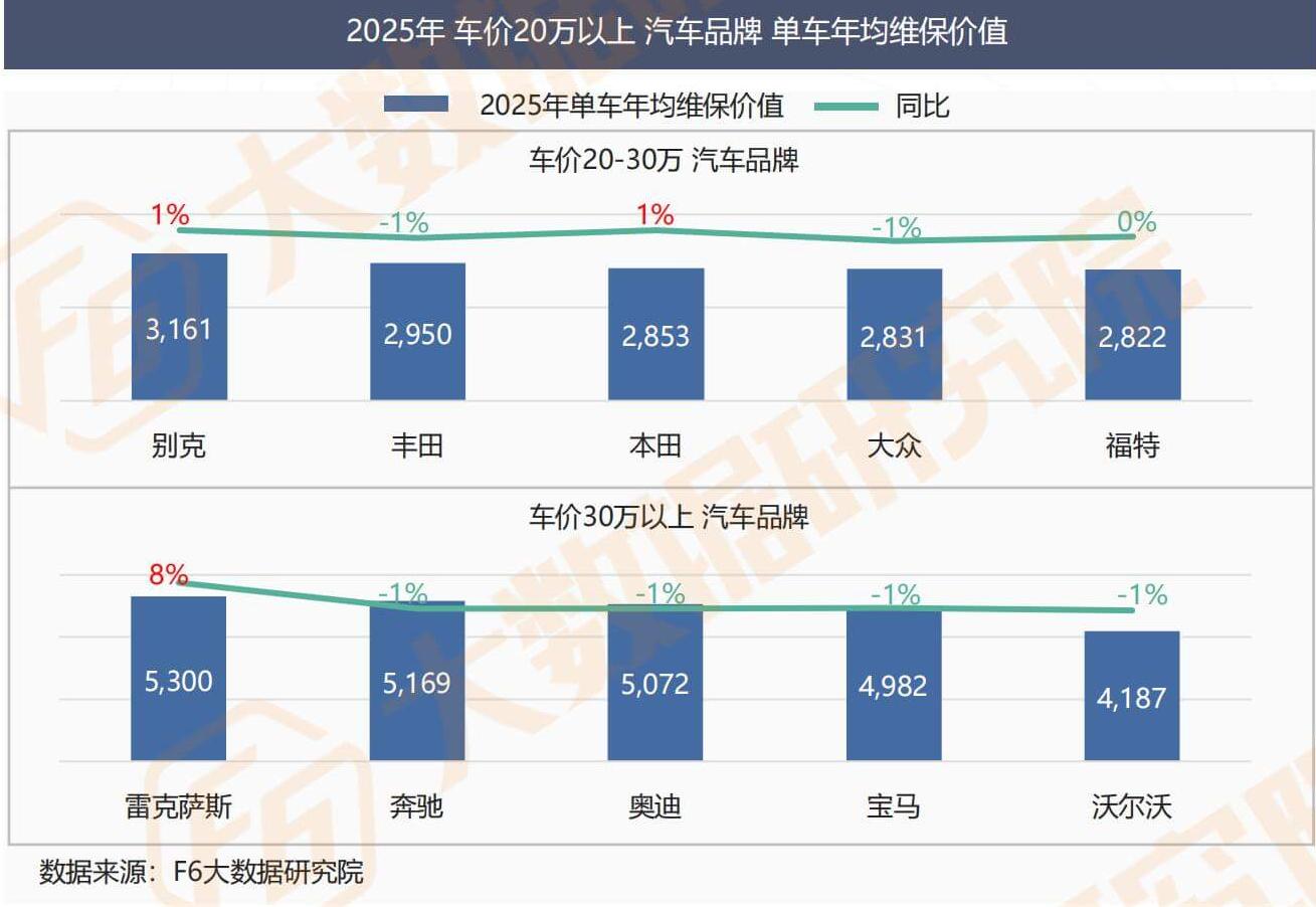 In the price range of 200000 to 300000 yuan, the average annual maintenance value of Buick owners' bicycles exceeds 3000 yuan, while the average annual maintenance value of Toyota, Honda, Volkswagen, and Ford owners fluctuates in the range of 2800-3000 yuan, and remains stable compared to 2024;