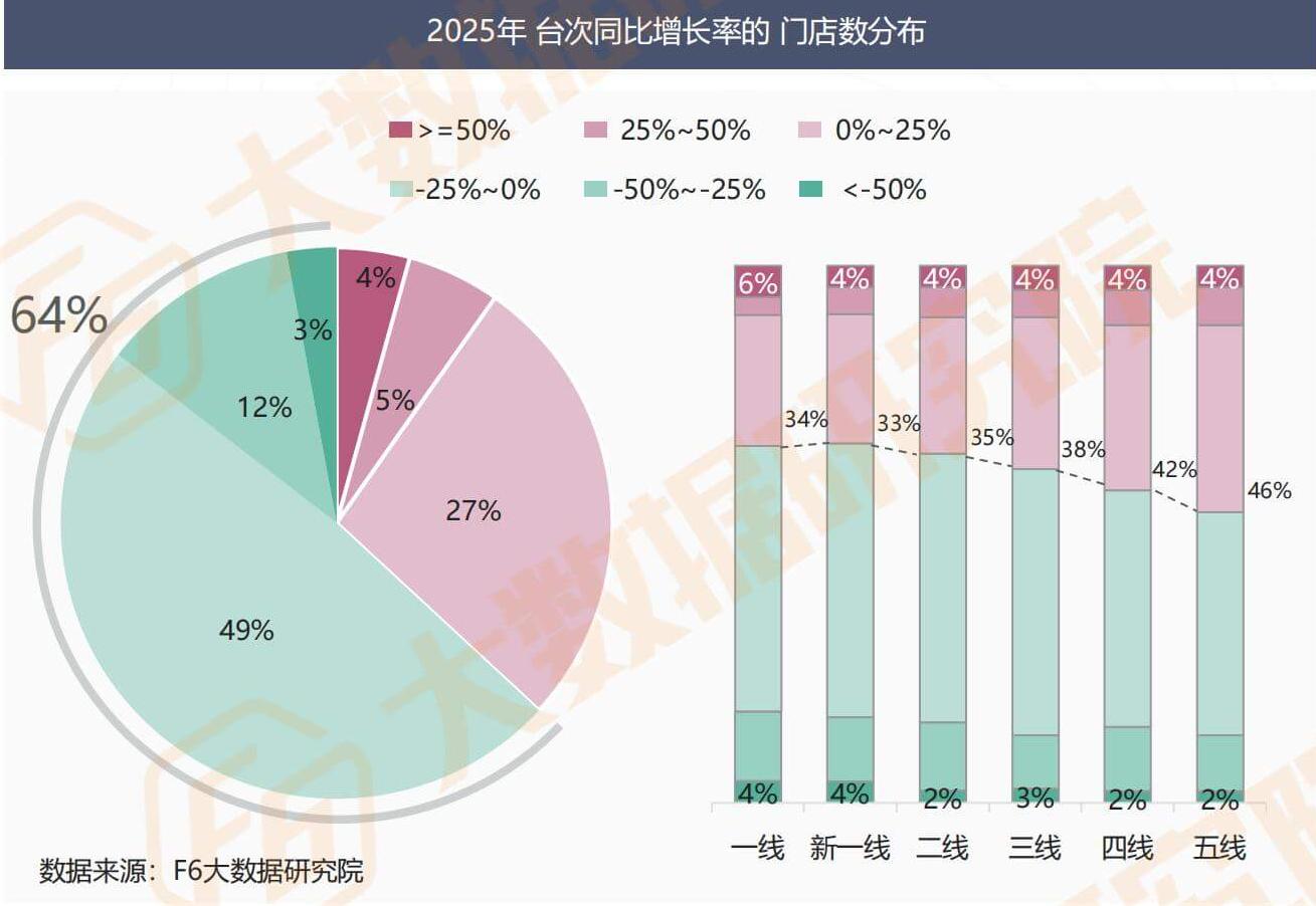 The distribution of the year-on-year growth rate of store numbers in 2025 and the segmented data at different city levels comprehensively reflect that the growth of store numbers is characterized by a medium to low range, and the impact of city level on the growth structure shows significant regularity. Specifically manifested as: