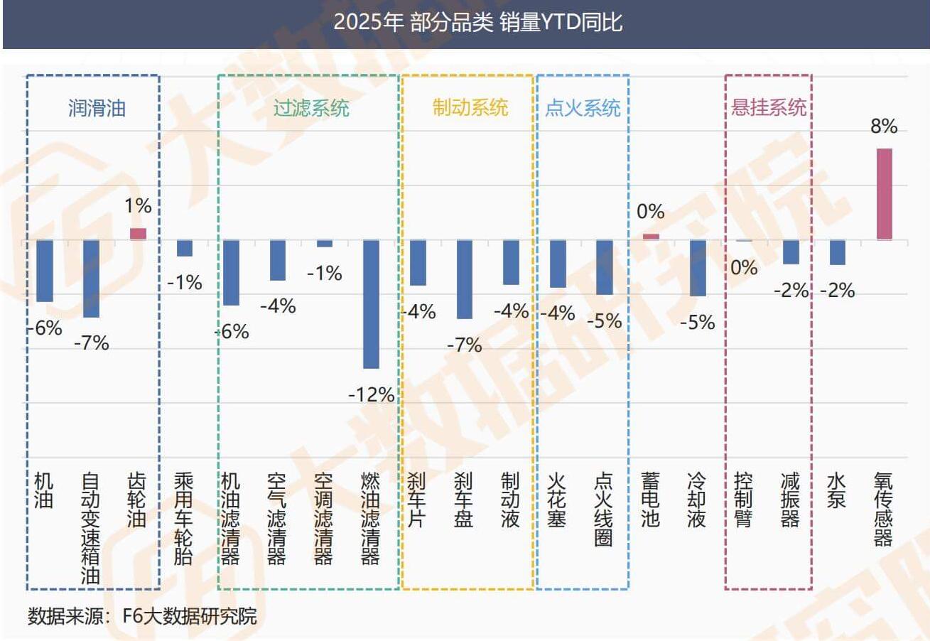 As of October 2025, the sales performance of various sub categories in the automotive aftermarket has shown a clear trend of differentiation. Specifically, the sales of gear oil increased slightly by 1% year-on-year, which is partly due to the continuous rise in sales of new energy vehicle models. Gear oil still has certain application demands in electric vehicles and hybrid systems. The sales of oxygen sensors achieved a year-on-year growth of 8%, with relatively outstanding performance. On the one hand, with the extension of the service life and the increase of accumulated mileage of some old vehicles, the demand for replacing oxygen sensors among car owners has increased; On the other hand, the comprehensive implementation of China VI emission standards has put forward higher requirements for exhaust emission control, and vehicles need to rely on the precise cooperation of oxygen sensors to ensure the compliance of emission indicators.