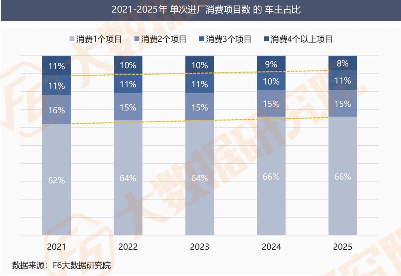 In 2025, the consumption behavior of car owners in the process of vehicle maintenance will show a more obvious "simplified" feature: the proportion of car owners who consume 4 or more items in a single factory visit will further decrease to 8%. This data not only sets a new low, but also continues the continuous downward trend in the past three years, reflecting that the multi item package consumption model is gradually being abandoned by car owners.