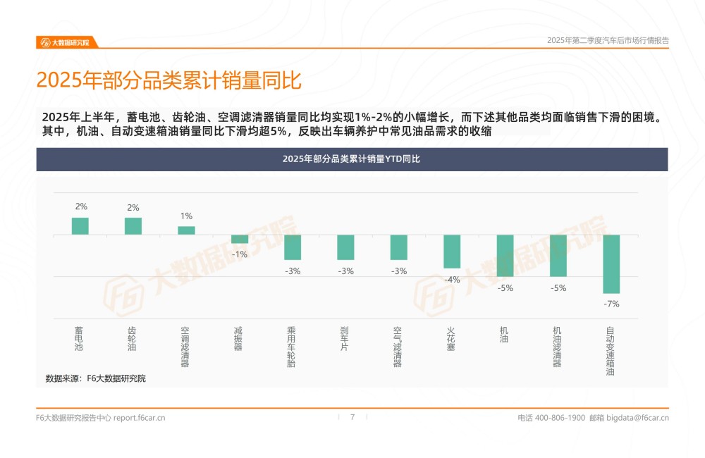 ▶ 上半年,蓄电池、齿轮油、空调滤清器销量同比实现1%-2%的小幅增长,机油、自动变速箱油同比下滑超5%,反映出车辆养护中常见油品需求的收缩。