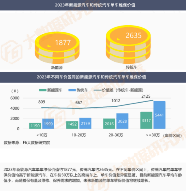 2023年新能源汽车单车维保价值约1877元,传统汽车约2635元。