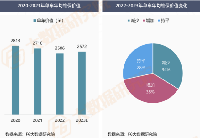 对比近2年单车年均维保价值,相较2022年,2023年34%车主消费减少,28%车主保持不变,换言之,62% 车主消费需求并未有所提高,这或将对维保规模持续快速增长带来一定压力。