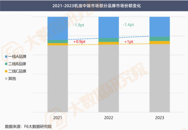 相较2021年,2023年机油中端市场份额增长1个百分点,市场竞争愈演愈烈